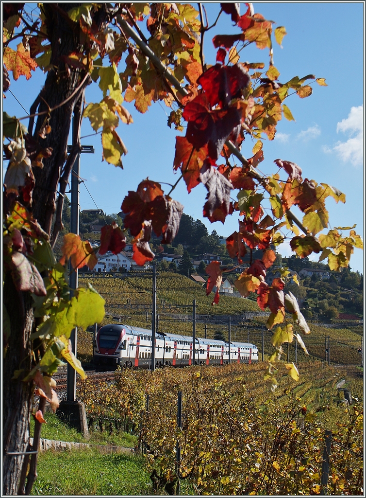 Fast hätte der SBB RABe 511 auf dem Weg nach Romont nicht zwischen die bunten Herbstblätter gepasst. Zwischen Bossière und Grandvaux, den 23. Okt. 2014 (zum Bild)