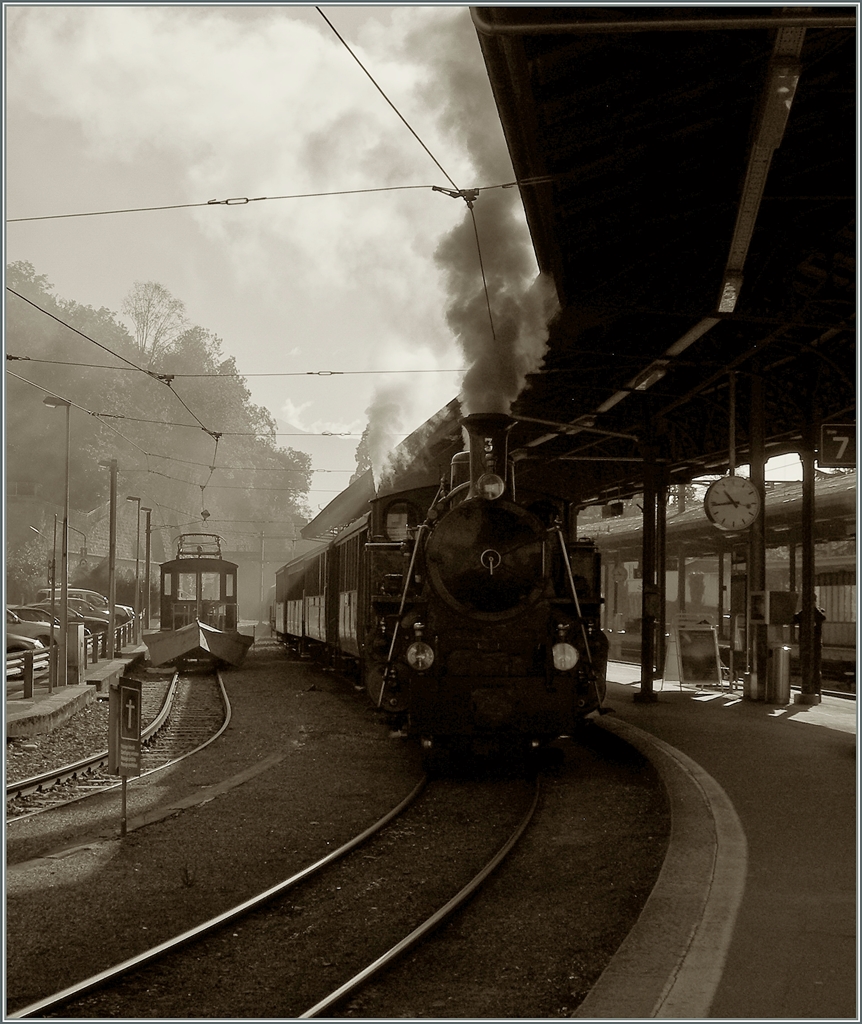 CEV GTW 2/6 7003 "Blonay" und MOB BDe 4/4 3004 in Blonay. 14. Okt. 2014 (zum Bild)