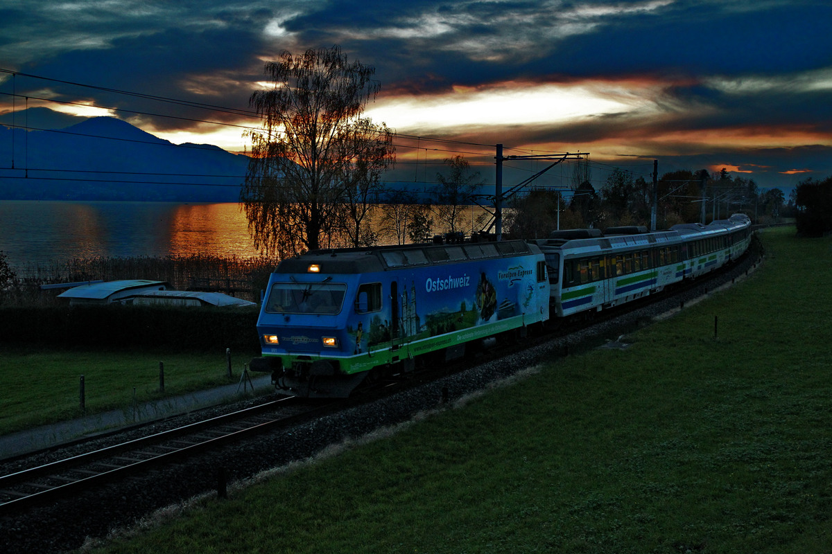 Re 456 091 als Zuglok am Voralpenexpress fährt nach Sonnenuntergang bei von starkem Föhn geprägter Wolkenstimmung bei Bollingen vorbei.Bild vom 3.11.2014 (zum Bild)