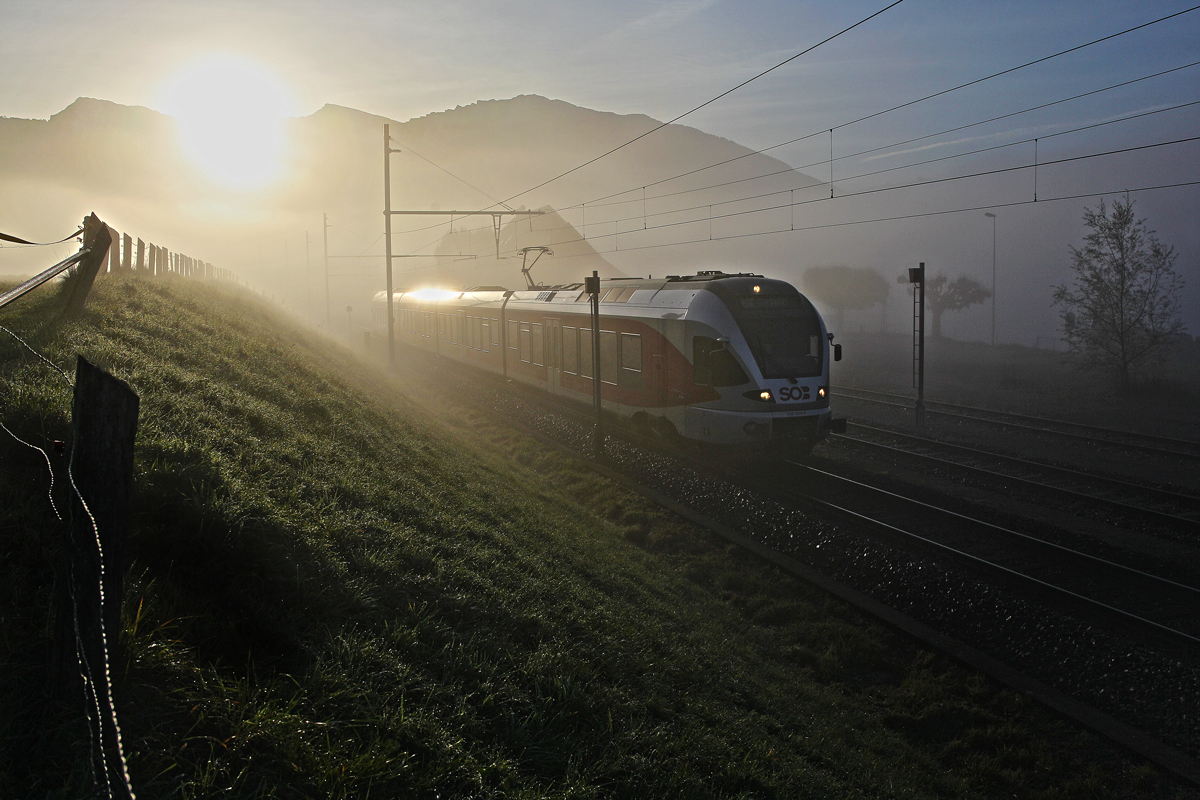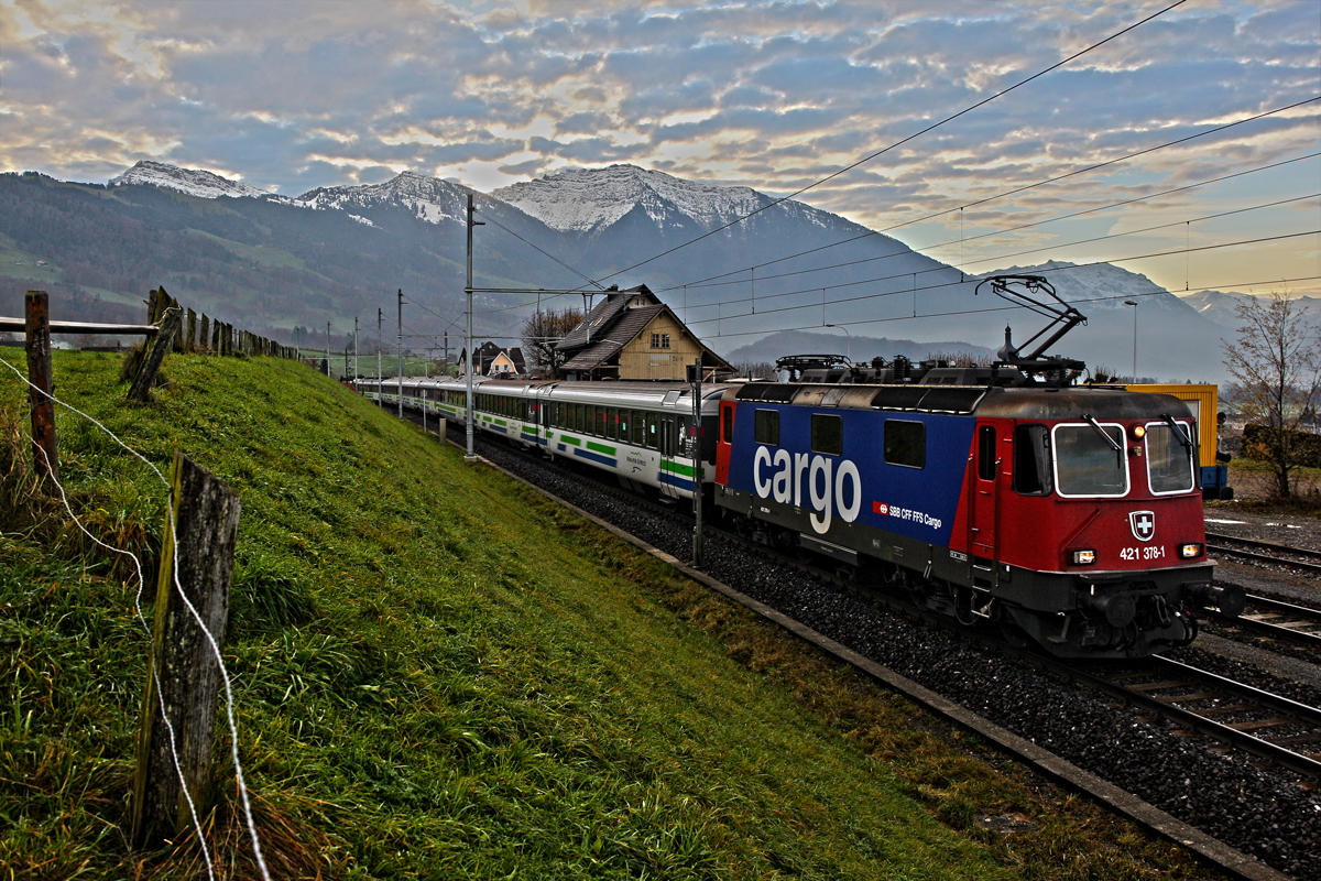 Shiftbild.Re 421 378-1 als Zuglok am Voralpenexpress frühmorgens bei starker Föhnstimmung bei der Durchfahrt am Bf Kaltbrunn.Bild vom 21.11.2014 (zum Bild)