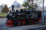 99 5906 am Morgen des 17.10.2014 im Bw Wernigerode. Auf die Lok kommt heute ein umfangreicher Dienst zu. Sie wird einen Sonderzug der IG HSB im Rahmen der dreitägigen Veranstaltung "Kleinbahnromantik im Selketal" von Wernigerode zum Brocken bringen, diesen dann über Drei Annen Hohne nach Eisfelder Talmühle und von dort über die Selketalbahn nach Gernrode befördern, wobei ca. 160 Kilometer zurückgelegt werden. Zusätzlich stehen noch mehrere Scheinanfahrten auf dem Programm. (zum Bild)