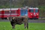 Linsenputzer Nr. 97163 steht gemütlich in Position vor der Rhb Lok Ge 4/4 II 617 "Ilanz" die einen RE nach Davos führt bei Schiers.Bild vom 20.10.2014 (zum Bild)