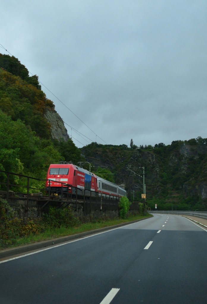 Bergwärts kommt die 101 006-5 auf der linken Rheinstrecke zwischen St. Goar und Oberwesel am 16.8.2015 als Werbelok für Graubünden den Fotografen entgegen als der im Auto talwärts unterwegs war. (zum Bild)