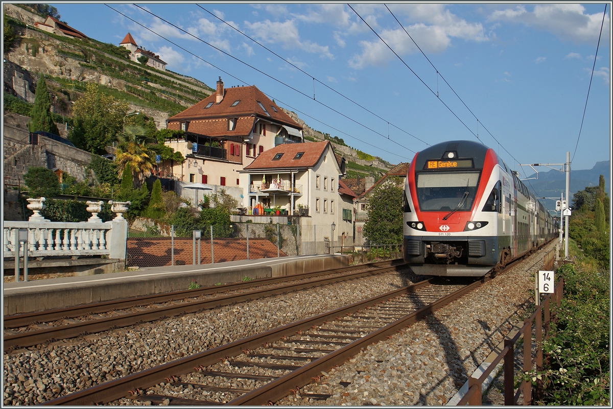 Der SBB RABe 511 120 erreicht die ohne Halt zu durchfahrende Haltestlele St-Saphorin. 31. August 2015 (zum Bild)