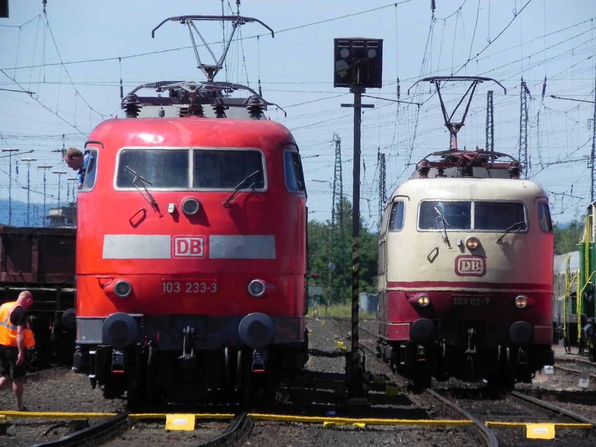 103 233-3 und 103 113-7 bei der Aufstellung zur Lokparade im DB Museum Koblenz am 14.06.2015. Erstere war nicht fahrbereit und wurde von einer anderen Lok der Baureihe 103 geschoben bzw. gezogen. (voir l'image)