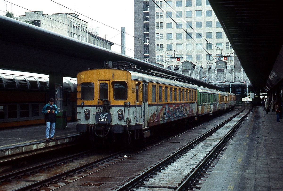 Metamorphose eines Triebwagens: Etwa drei Jahre nach der Aufnahme in Como präsentiert sich der E.740-21 der Ferrovie Nord Milano im Mai 1996 völlig verschmiert in Milano Nord (voir l'image)