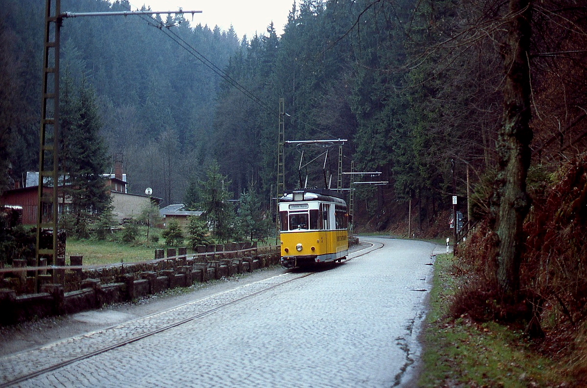 Eine Kurve noch und Tw 3 der Kirnitzschtalbahn hat die Endhaltestelle Lichtenhainer Wasserfall erreicht (Anfang April 2000) (voir l'image)