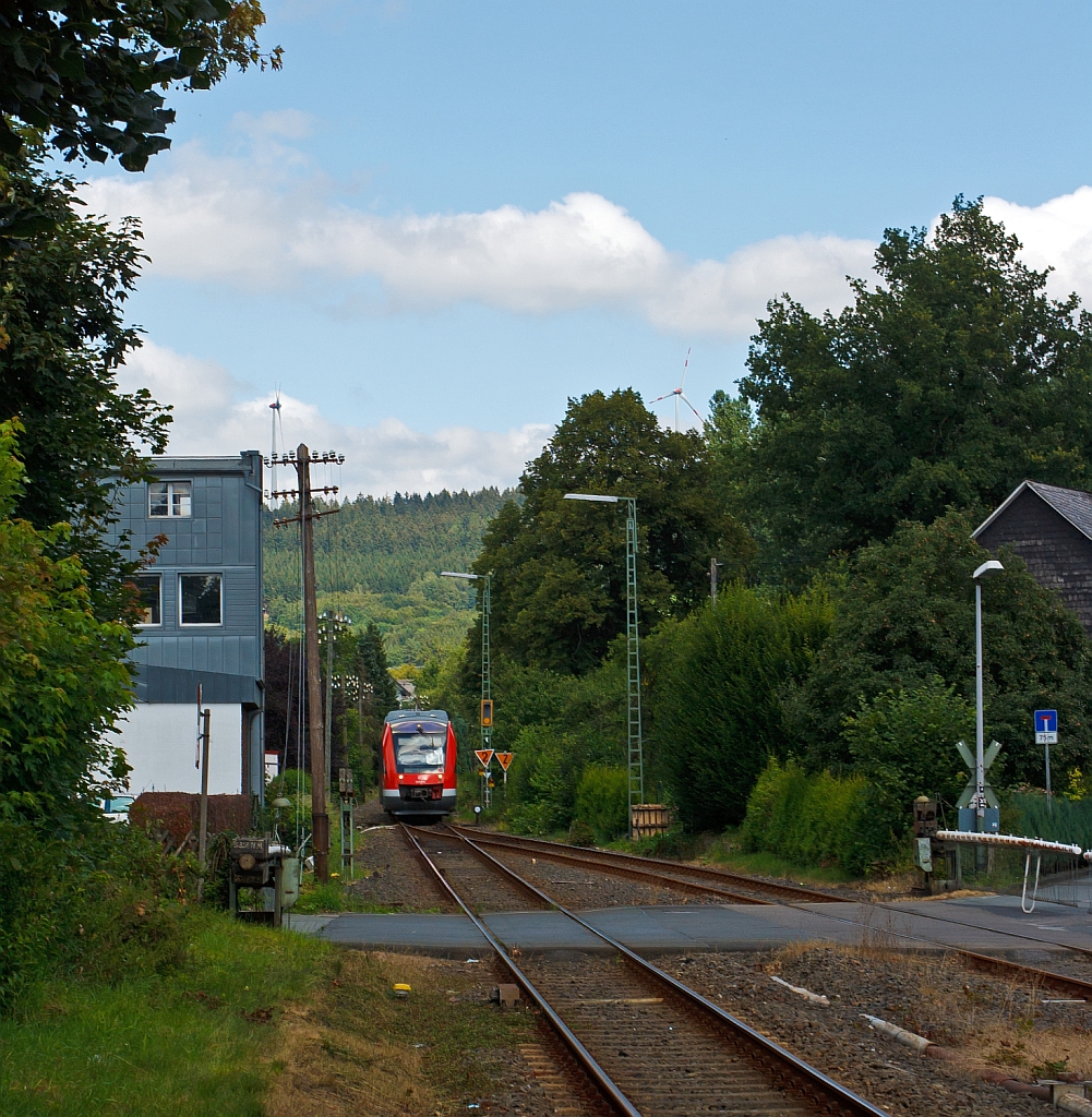 640 008 (LINT 27) der 3-Länder-Bahn als RB 93 (Rothaarbahn) kommt von Bad Berleburg hier am 11.08.2012 an einem unbeschrankten Bahnübergang in Kreutztal-Ferndorf, nächter Halt Bf Ferndorf. (alla foto)