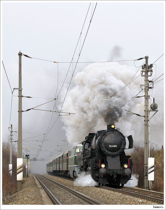 Die beiden Dampfloks 52.100 & 52.4984 fahren als SREX 16170 von Korneuburg nach Ernstbrunn zum 3.Oldtimertreffen. Mollmannsdorf 2.5.2010 (alla foto)