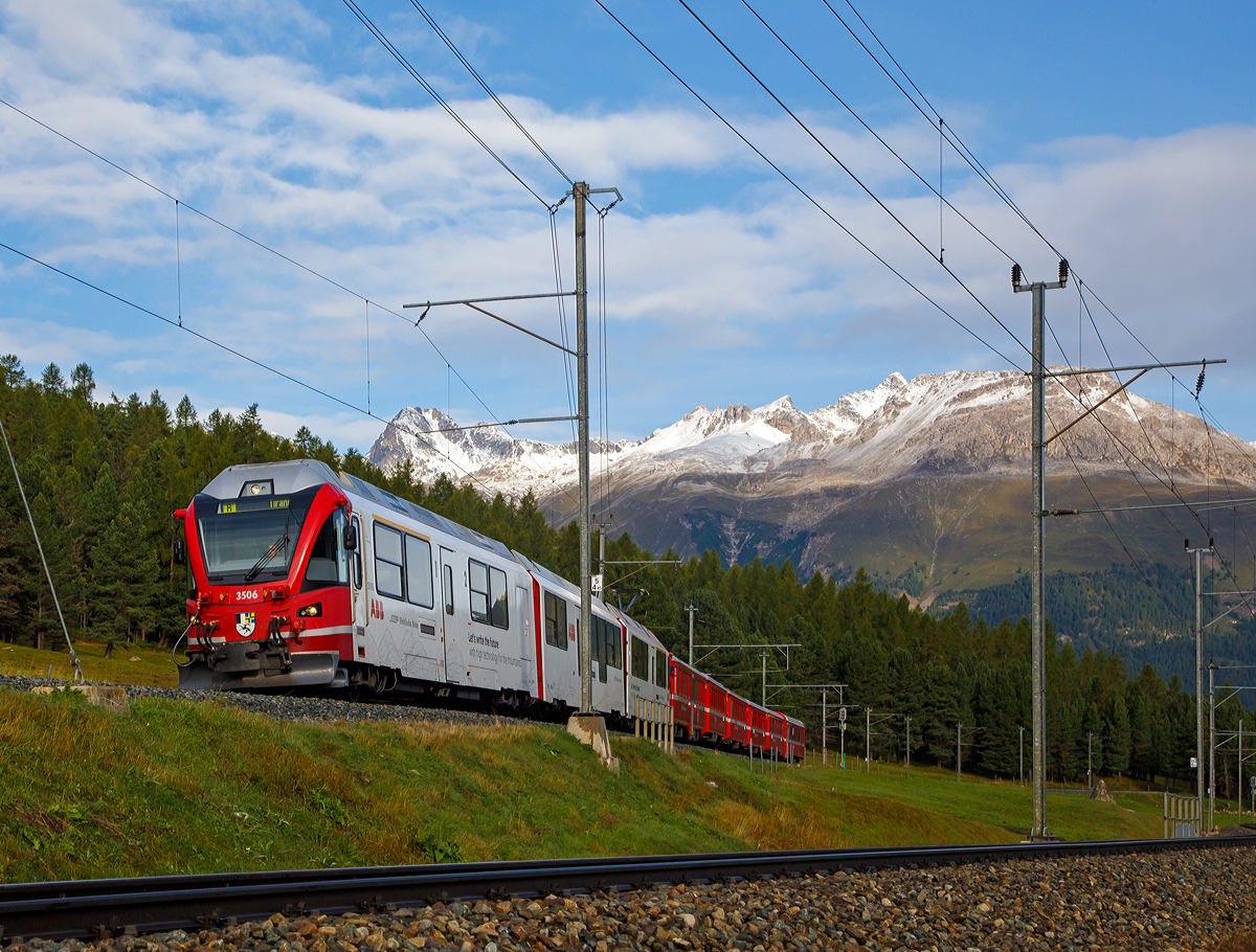Geführt von dem RhB ALLEGRA-Zweispannungstriebzug (RhB ABe 8/12) 3506 "Anna von Plantai" erreicht der RhB Regio-Zug nach Tirano am morgen des 13.09.2017 bald den Bahnhof Pontresina. (zum Bild)