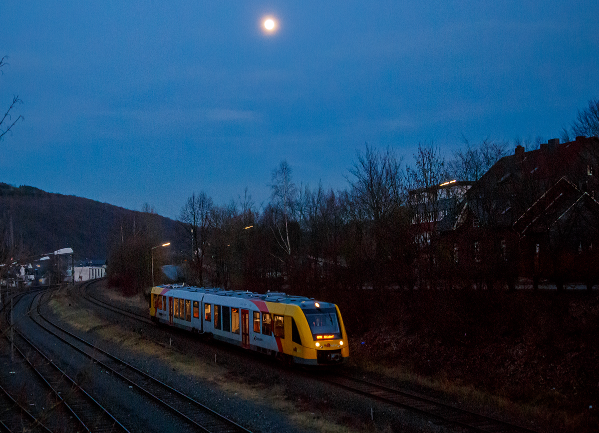 Noch ist er nicht ganz voll..... Ein Alstom Coradia LINT 41 neue Generation der HLB (Hessische Landesbahn GmbH) erreicht am 18.02.2019 als RB 96 "Hellertalbahn" bald den Bahnhof Herdorf. (zum Bild)
