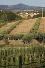 Wàhrend im Vordergund edle Tropfen heranreifen, fährt im Hintergrund ein edeler Zug vorbei; kurzum: Ein Prachtsbild.