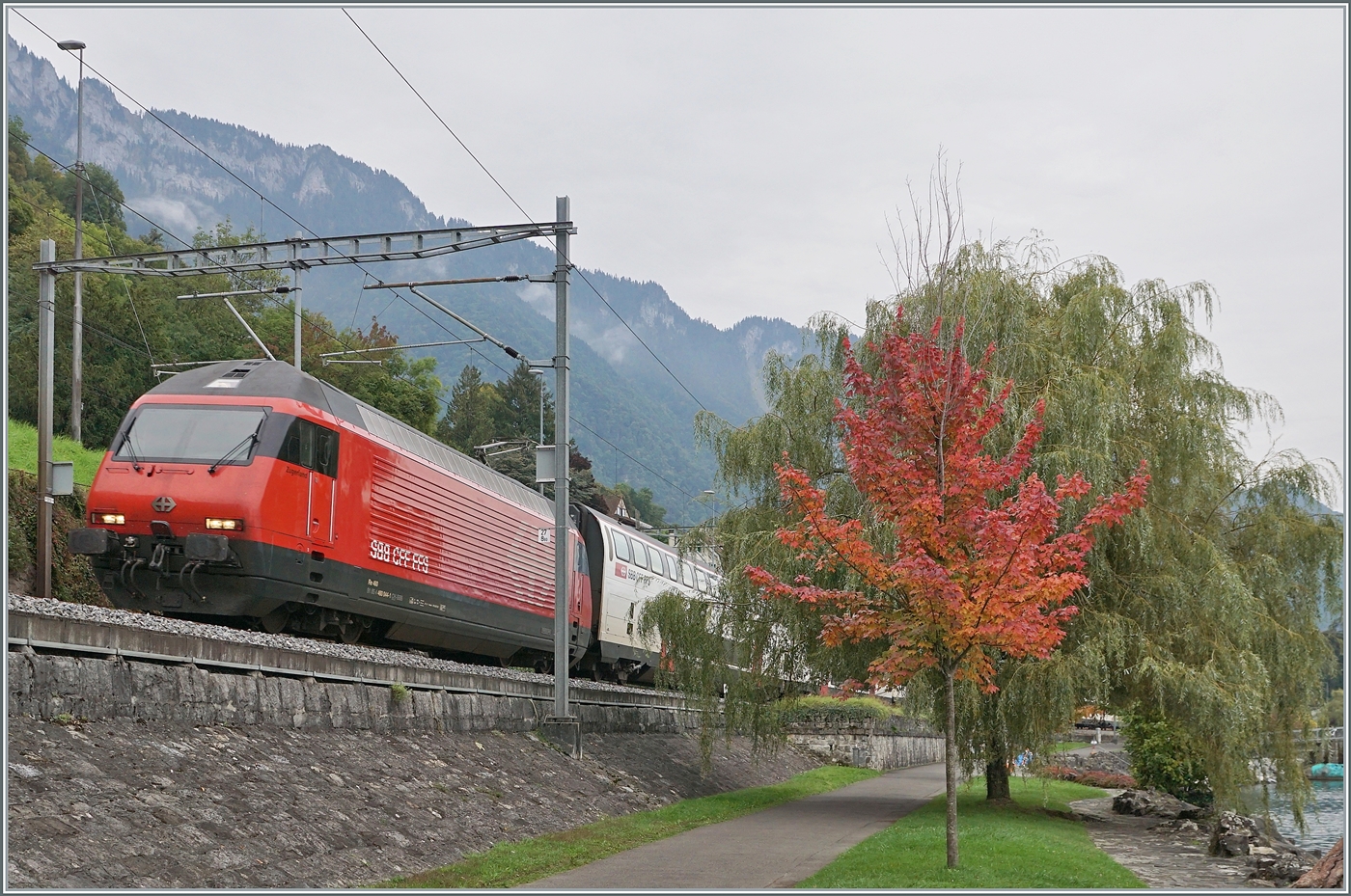 Der Herbst steht vor der Tür, bzw neben dem Gleis; der bunte Baum rechts im Bild bewog mich auf einem Spaziergang bei Villeneuve zu diesem Schnappschuss. Links im Bild ist die SBB Re 460 044-1 mit ihrem IR95 1712 auf der Fahrt von Brig nach Genève Aéroport zu sehen. 3. Oktober 2025 (zum Bild)