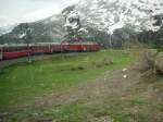 Ein wunderbares Bild vom Bernina Express in der baumlos üppigen Vegetation an der Bernina!