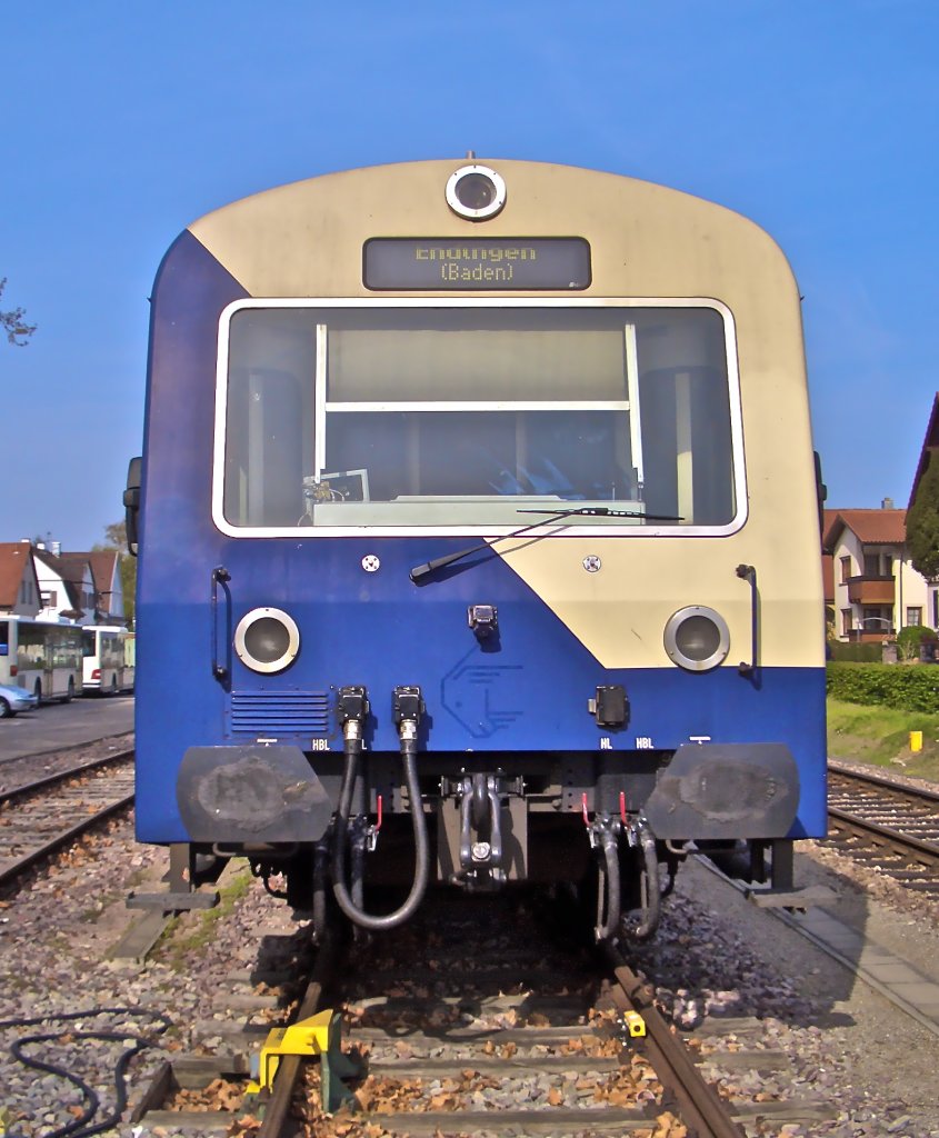 Das ist einer von drei 1993-1994 als VT60 bis VT62 an die Bodensee-Oberschwaben-Bahn ausgelieferten NE81, dort 2006 von RegioShuttles (RS1) abgelöst. Die NE81 gingen anschließend an das von der HzL betriebene seehäsle (Radolfzell - Stockach), als nachfolger von prototyp-GTW der MThB/Thurbo, die sich nicht so gut bewährten. Dort erhielten sie die beige Ecke (vorher komplett blau). Die HzL hat auf dieser linie ab 2008 neue RegioShuttles eingesetzt und die NE81 an die SWEG verkauft, die sie als VT128 bis VT130 bezeichnet und modernisiert, dabei werden sie weiß-blau angestrichen. Dieser triebwagen ist jedoch noch im seehäsle-design, auf der front ist sogar noch das geißbocklogo der BOB zu erahnen. Die SWEG fährt heute am Kaiserstuhl überwiegend mit RS1, hat aber noch einige NE81 für die rush hour. Übrigens ging im gegenzug 2009 der VT121, ein NE81 der ersten serie, an die HzL, wo er im stammnetz eingesetzt wird (warum die HzL nicht stattdessen einfach einen der ex-BOB-NE81 behalten hat, weiß ich auch nicht).