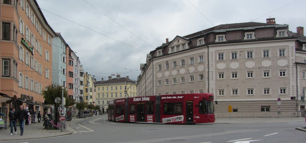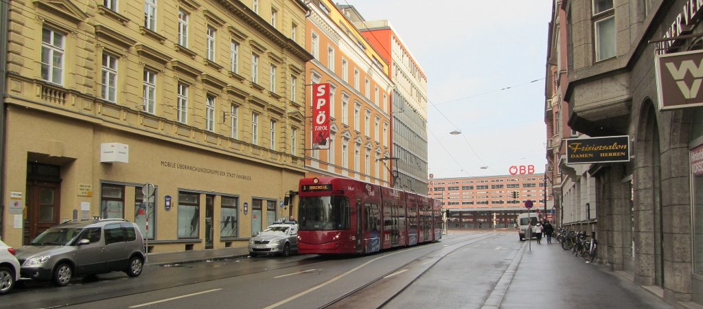 Wofür die Politik nichts kann ist, daß das nicht in der Maria-Theresien-Straße ist, dort fährt keine Tram mehr, seit man die nagelneuen Gleise herausgerissen hat (also doch wieder Politik). Das Bild zeigt den Marktgraben, im wuchtigen Haus rechts ist die Innsbrucker Außenstelle des Mozarteums Salzburg untergebracht (nebst der Landesmusikschule).