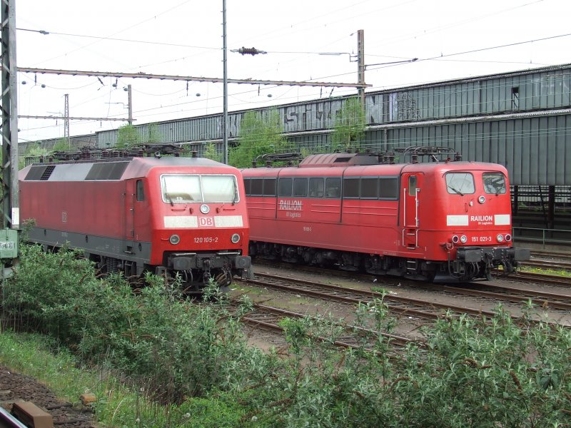 120 105-2 und 151 021-3 mit rotem Rahmen beides seltene Gäste in Wanne-Eickel Hbf. 17.4.07 (zum Bild)