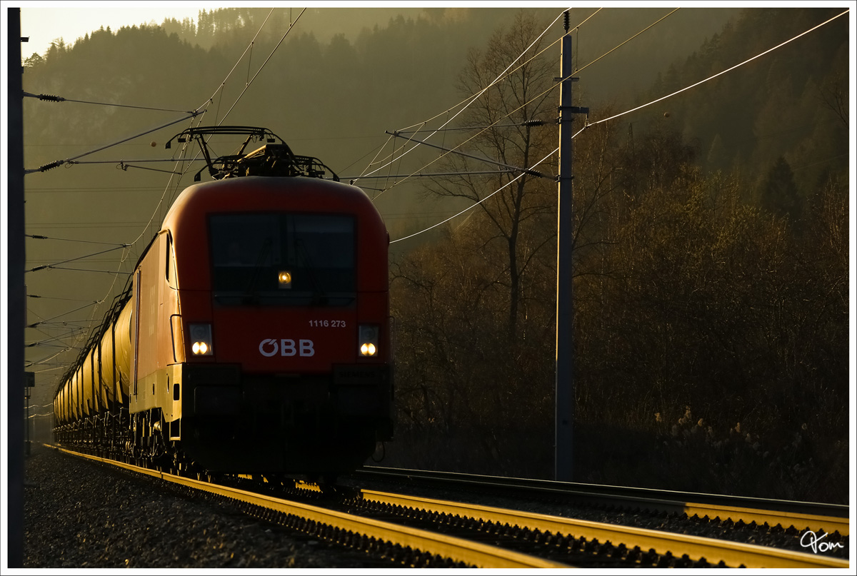 In der Abendsonne, fährt 1116 273 mit einem Kesselzug durch Sauerbrunn. 13.3.2013 (zum Bild)