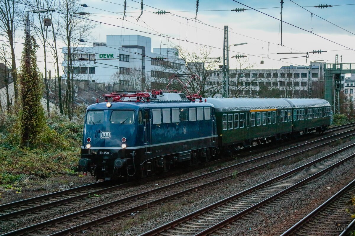 DB 110 350-6 mit zwei D-Zug Waggons in Wuppertal, Dezember 2024. (zum Bild)