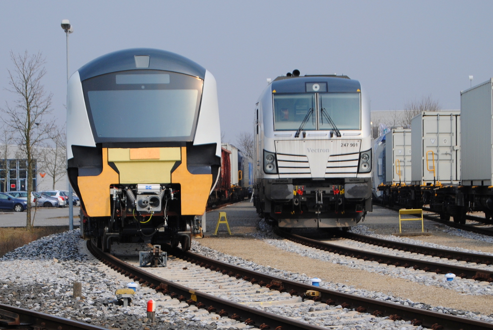 Zaunblick am 28.3.2013. Ein Unbekannter Triebkopf neben Vectron DE 247 901 (zum Bild)