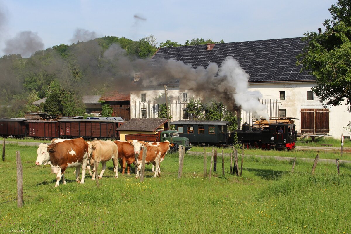 Mit einem typischen Verschubgüterzug aus den 70er Jahren steht die 298.53 am 10.5.2024 im Bahnhof Sommerhubermühle und wartet hier auf die Weiterfahrt von Grünburg kommend in Richtung Steyr Lokalbahnhof. Recht neugierig waren die Damen im Vordergrund nicht, war der Fotograf doch interessanter. (zum Bild)