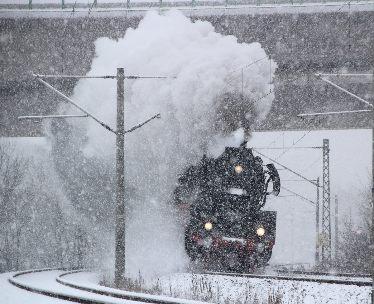 ein schönes Dampflokbild im Schneegestöber.