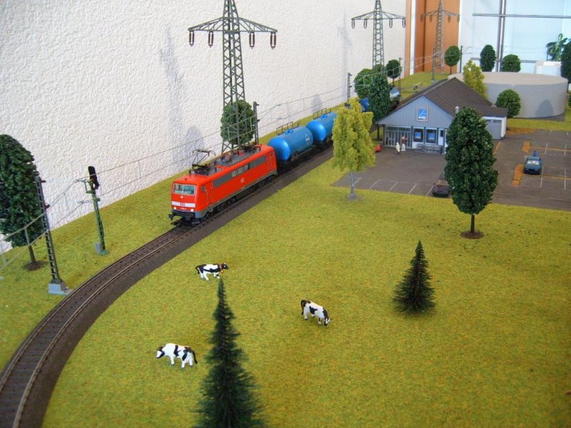 Ein idyllischer Fotostandpunkt (aus meiner Sicht) auf meiner Modellbahnanlage: BR 111 095-6 mit einem Aral-Kesselwagenzug vor rotem Signal. 11.05.07. (alla foto)