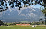 Nachschüsse haben auch ihren speziellen Reiz, blickt man doch in die Richtung in die der Zug fährt. Die Bildwirkung durch die schöne Landschaft wird hier noch durch das Maisfeld im Vordergrund gesteigert.