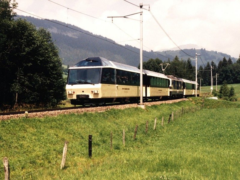 ja die MOB war seinerzeit mit dieser Zugbildung im Tourismus weit vorraus. Wenn ich mich recht entsinne wurden diese Züge Mitte der 80er auf die Gleise gestellt. Die dürfte, glaub ich, noch heute die einzige Bahn in Europa sein, die exclusiv reservierbare Frontplätze in ihren Zügen anbietet. Damals fuhr der Zug als "Crystal-Panoramic-Express". Heute fährt er als "GoldenPass Panoramic" und wie ich gerade sehe sogar wieder, wie früher, nach Lenk im Simmental statt nur bis Zweisimmen. Statt der GDe 4/4 kommt heute zumeist eine Ge 4/4 III zu einsatz, wie sie auch bei der Rhätischen Bahn eingesetzt wird.
