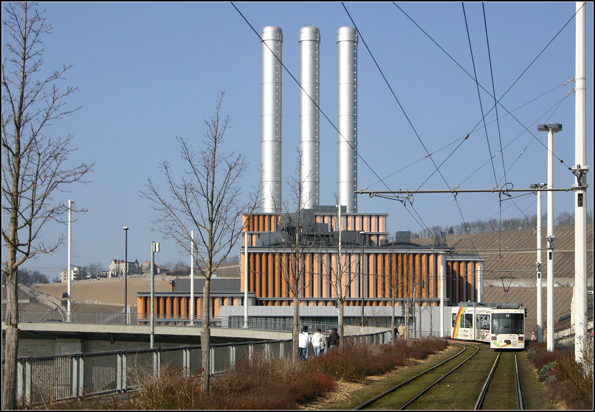 Sehr viel Beton in der Landschaft und doch irgendwie (aus diesem Blickwinkel) ästhetisch. Da paßt auch die kantige Straßenbahn perfekt ins Bild.