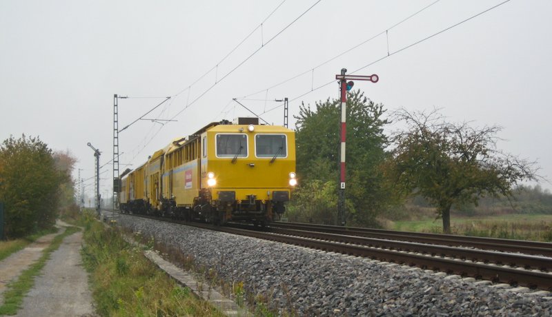 Eine Unimat 4s (Stopfmaschine) von Plasser & Theurer am 27. Oktober 2009 mit weiteren Baufahrzeugen an der Bk Basheide. Inhaber wahrscheinlich Schweerbau oder DGT. Viele Grüße an den Tf! (zum Bild)