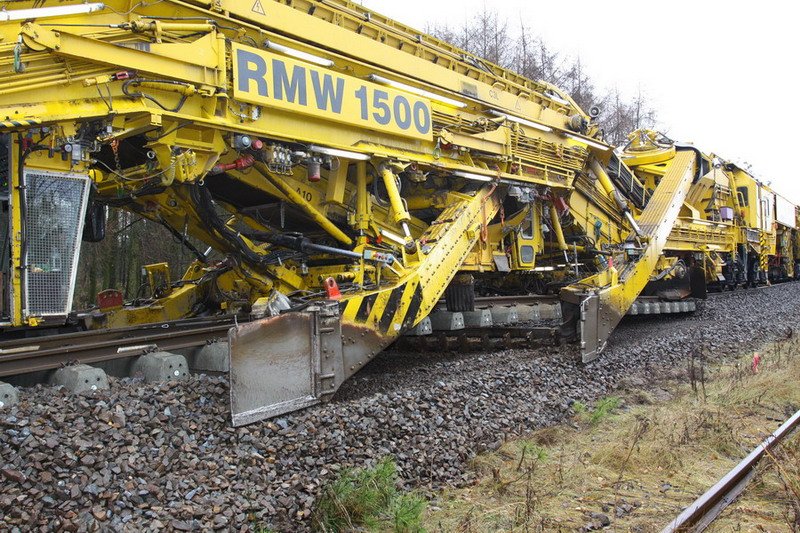 Hier handelt es sich um eine RPM, das ist eine Planumsverbesserungsmaschine. Diese saniert während der Fahrt (natürlich sehr langsam!) den Untergrund des Gleises. Der alte Schotter und das Material darunter wird "rausgegraben", gereinigt und zum Teil wieder eingebaut. Die Wagen vor und hinter der Maschine sind für den Abtransport der nicht mehr zu verwendenden Altstoffe und die Zuführung von neuem Schotter zuständig. Das Ding in Aktion zu sehen, ist eine Schau. Eine ähnliche, noch modernere Masch dieser Art ist dieser Tage irgendwo bei Dinkelscherben (Bayern) im Einsatz zu sehen. Hoffentlich konnte ich Dir helfen, auch wenn´s etwas lang geworden ist.