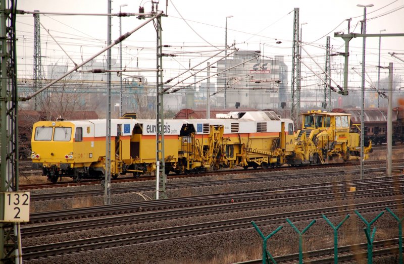 Am 07.03.09 standen diese beiden Gleisbaufahrzeuge in Bitterfeld abgestellt. Bei der ersten Maschine handelt es sich um eine Stopfmaschine und bei der zweiten um eine Schotterprofiliermaschine. (zum Bild)