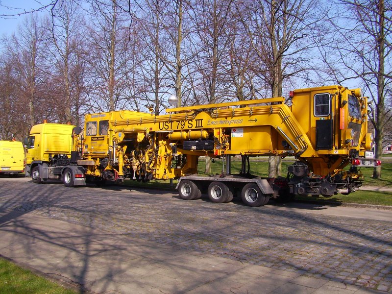 Dieser LKW mit einer (halben) Stopfmaschine stand am 01.04.2009 in Hannover bei den Herrenhäuser Gärten auf dem Parkplatz (zum Bild)