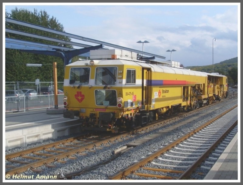 Eine Gleisbaumaschine der niederländischen Firma Strukton Railinfra Materieel (SRM) fuhr am 03.10.2008 durch den Bahnhof Wiebelsbach. Im Zuge der Bauarbeiten zur Inbetriebnahme des elektronischen Stellwerks in Wiebelsbach wurden im Südabschnitt der Odenwaldbahn auch partiell Gleise ausgetauscht, das erklärte die Anwesenheit dieses Fahrzeugs. (zum Bild)