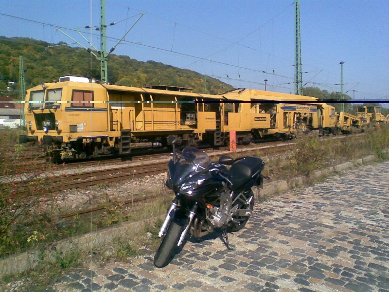 Hier sind Job und Hobby vereint. Eine yamaha FZ6 Fazer, im Hintergrund die USM 09 - 32/4S + SSP 110 SW. Fotografiert auf dem Bahnhof Großheringen am 21.10.08, also kurz vor Ende der Motorradsaison. (zum Bild)