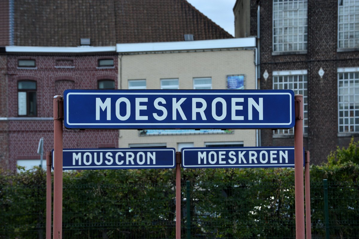 Die Zeichen in zwei Sprachen hat nichts mit der Grenze zu Frankreich tun, aber Mouscron ist eine Gemeinde mit Sprache Einrichtungen, wie auch Voeren in Provinz Limburg, und ebenfalls Comines-Warneton