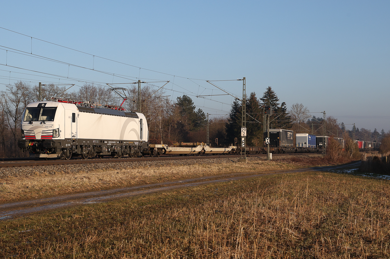 Letztes Jahr noch DB rot, jetzt weiss 193 314 Vectron bei Zorneding. 21.1.25. Nachtrag: 6 193 und 7 193 sind unterschiedlich. Doch kein Halterwechsel. (zum Bild)