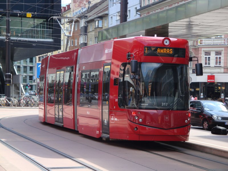 Die Szene ist am Bahnhofsvorplatz selbst, also in größtmöglicher Nähe zum Bahnhof. Dieser Kurs der Linie 3 zieht als nächstes die Salurnerstraße hinunter (bei der GIS vorbei) zur Triumphpforte, wo er dann in die Maria Theresien-Straße einbiegen wird.