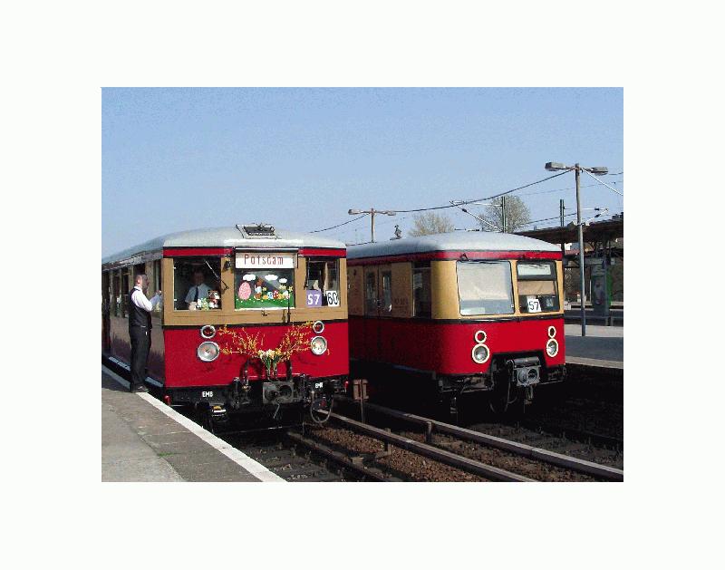 Der Osterzug der Berliner S-Bahn war am 01.04.2002 morgens auf Sonderfahrten und anschließend im Umlauf 60 der S7 unterwegs. Um 17.10 h rückt er vom Bahnhof Charlottenburg zum Betriebswerk Grunewald ein.