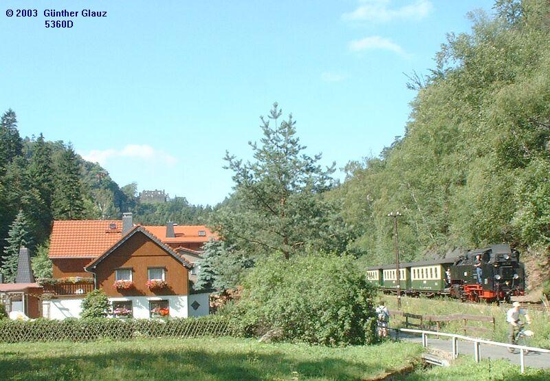 99 731 mit Personenzug am 14.07.2003 im "Hausgrund" zwischen Kurort Oybin und Teufelsmühle. Hinter dem Haus die Burgruine Oybin, links daneben der Berg Oybin.
