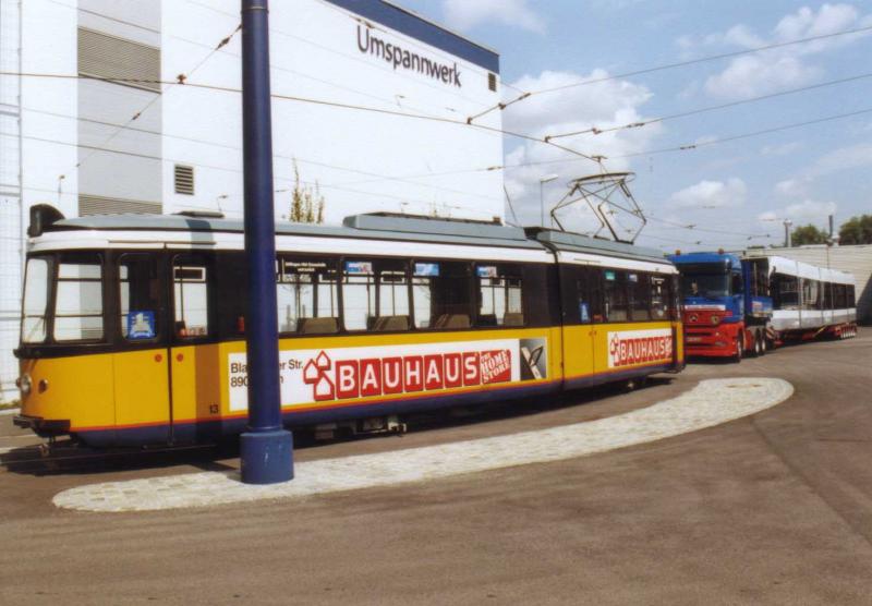 Alt trifft neu: Im Vordergrund der ca. 40 Jahre alte Ulmer Triebwagen Nr. 13 (Typ GT 4 der Maschinenfabrik Esslingen) - dahinter der nagelneue Combino, noch auf dem Spezialtransporter, welcher gerade in die richtige Position fährt, um den Combino auf die Ulmer Schienen abzulassen.