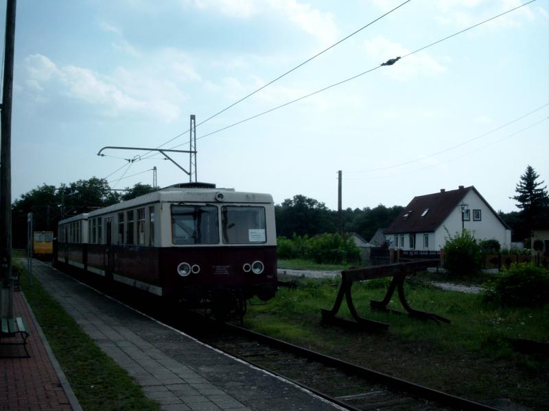 Dieser Triebzug ist leider nicht mehr einsatzfähig. Die Eisenbahnfreunde, die die Buckower Kleinbahn liebevoll betreiben, hoffen, ihn eines Tages wieder fahrtüchtig zu machen. Zur Zeit hat die Buckower Kleinbahn zwei einsatzfähige Triebzüge. Buckow, 3.8.03