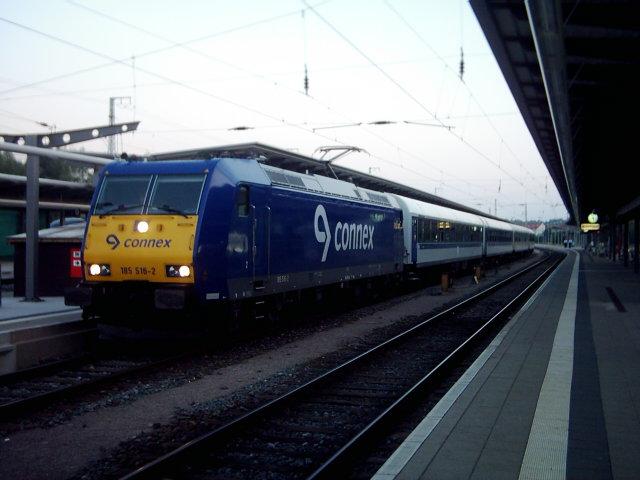 Auch hier fährt er her: Der InterConnex mit seiner 185 515 macht Halt in Eichenberg. Der Zug kommt von Rostock und fährt in Richtung Köln.