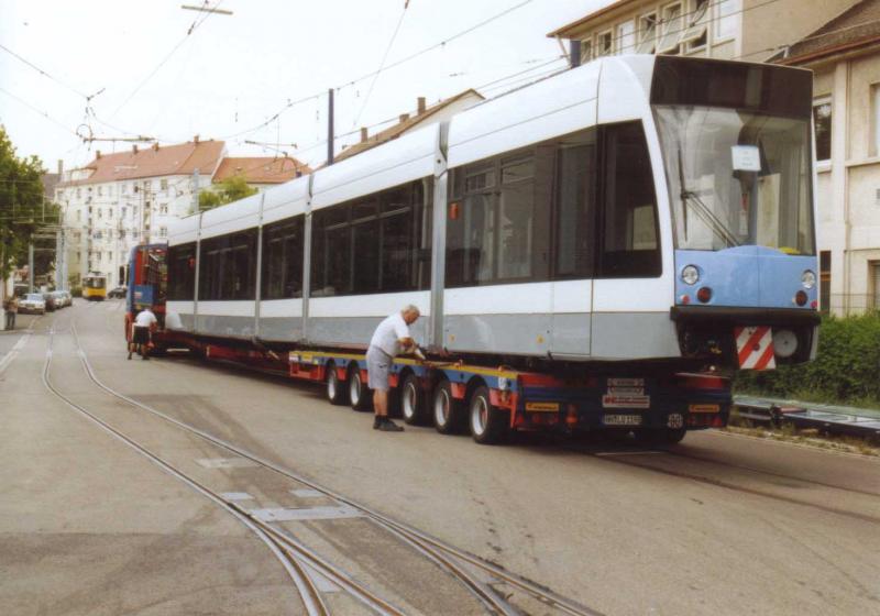 Ein funkelnagelneuer Triebwagen "Siemens Combino" für die Ulmer Straßenbahn wird gerade per Spezialtransporter angeliefert. Das Bild entstand am Dienstag, 22. Juli 2003, in Ulm, amWestplatz, in unmittelbarer Nähe des Straßenbahnbetriebshofes der Stadtwerke Ulm. Im Hintergrund auf den Schienen ein alter "GT 4"-Triebwagen.