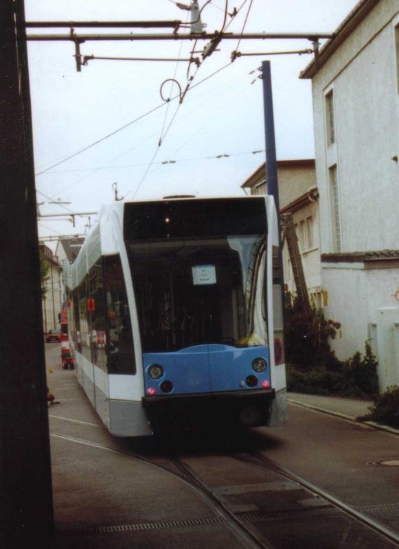 22.7.2003, ca. 13.30 Uhr: Hier ist die Länge des "Combino"-Triebwagens deutlich zu sehen - immerhin 31 Meter! Gleich hat er die Abrollrampe verlassen.