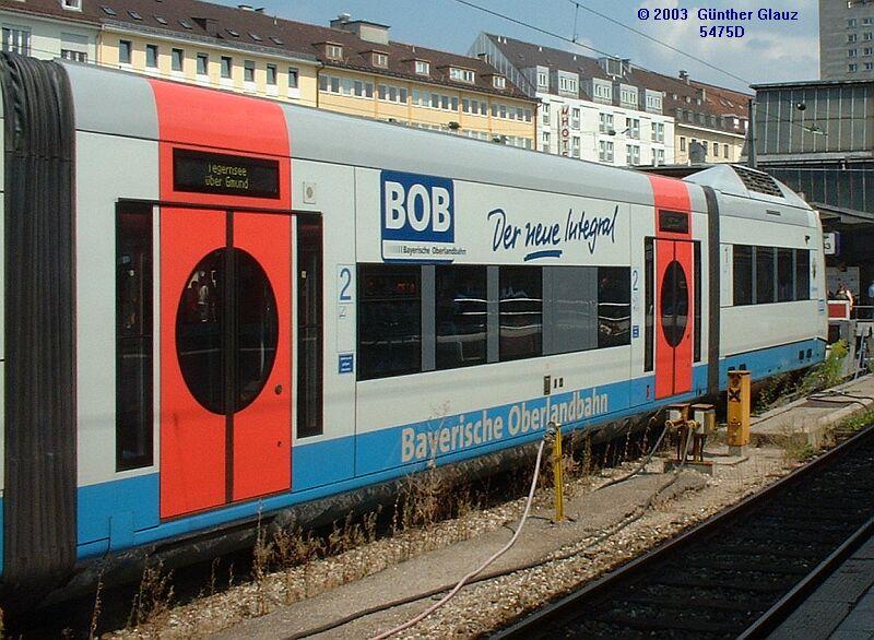 3 Integral der BOB (Bayerische Oberlandbahn) am 02.08.2003 in München Holzkirchner Bahnhof (Hauptbahnhof). Von vorn nach hinten: VT 114 "Fischbachau" nach Bayrischzell, VT 105 nach Lenggries und VT 116 "Schliersee" nach Tegernsee. Die Triebzüge werden in Holzkirchen und Schaftlach getrennt.