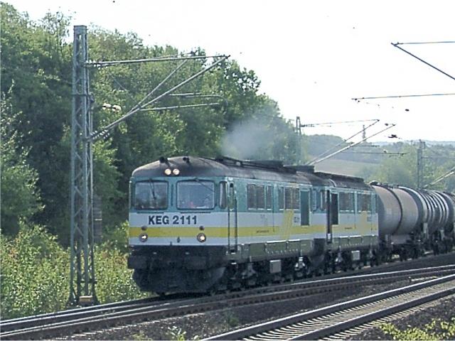 Ausgerechnet jetzt machte die Digitalkamera Ärger: KEG 2111 und Schwesterlok mit Kesselwagenzug kurz vor Ronshausen auf dem Weg in Richtung Eisenach. Das Bild ist wegen zu frühem Auslösen ein Ausschnitt und leider etwas "grisselig".