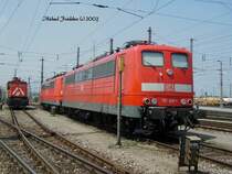 112 113 ist mit dem Nachtzug von Stuttgart/München/Zürich in Dresden-Neustadt angekommen. Um ihn nach Dresden-Altstadt zu bringen, wo er bis zur Rückfahrt abgestellt wird und wo es jedoch keine Oberleitung gibt, ist die 365 149 vorgespannt (27.06.03)