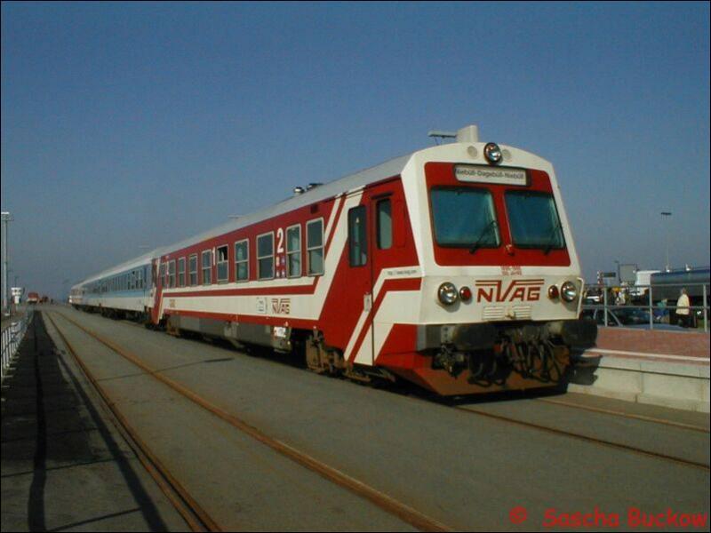 Ein Triebwagen der NVAG steht mit drei Kurswagen für den IC nach Köln in Dagebüll Mole. Hier wartet er auf Reisende, die mit den Schiffen von den Nordseeinseln kommen.